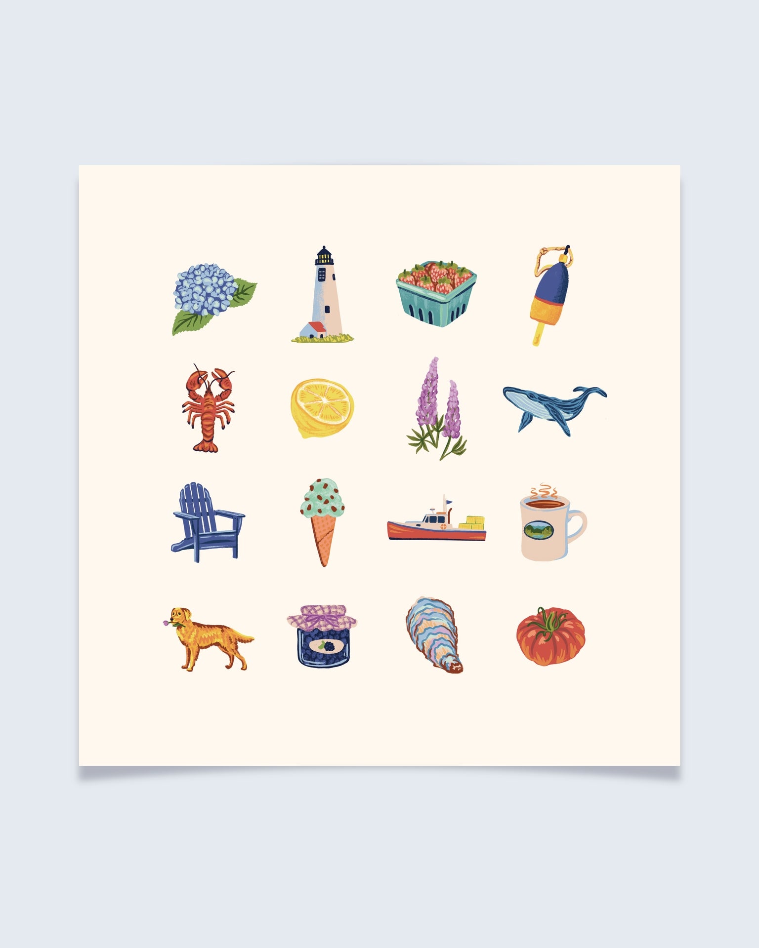 Salt Air is a hand-illustrated art print inspired by the charm of coastal New England — hydrangeas in bloom, fresh strawberries from the market, coffee by the harbor, and long afternoons filled with sunshine and salt breeze. Each illustration is a little love note to the simple pleasures of life by the sea.