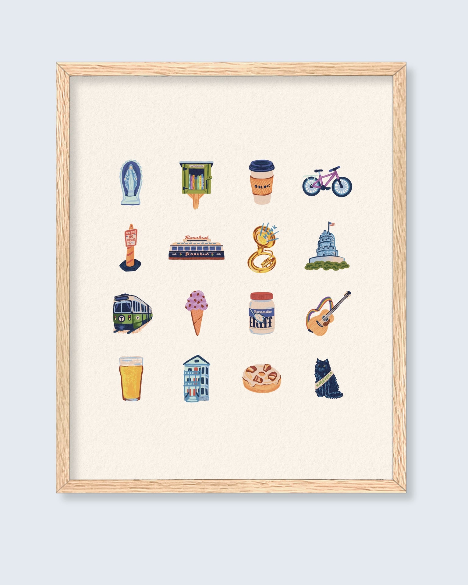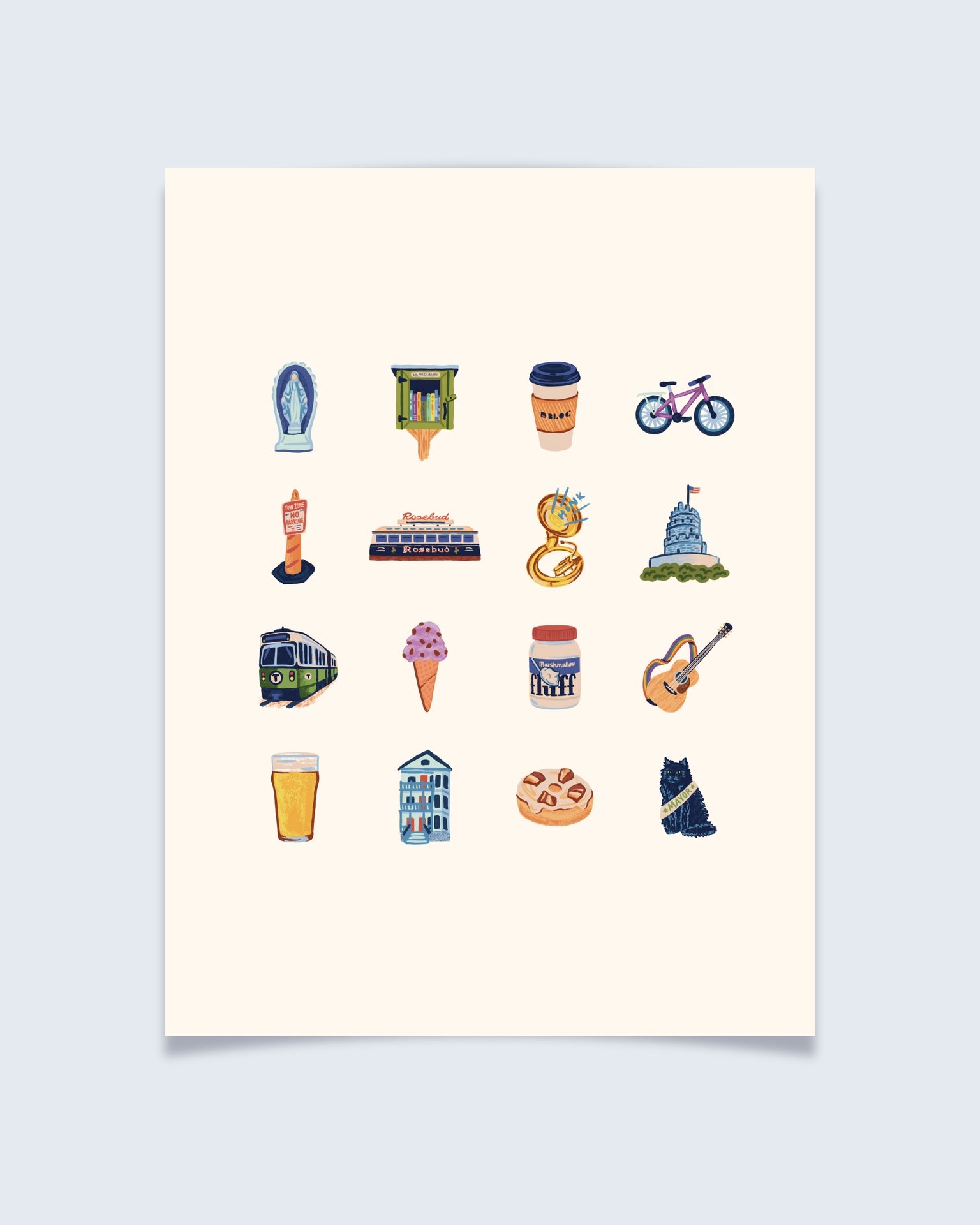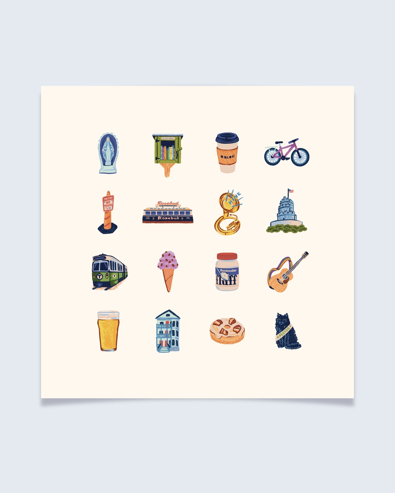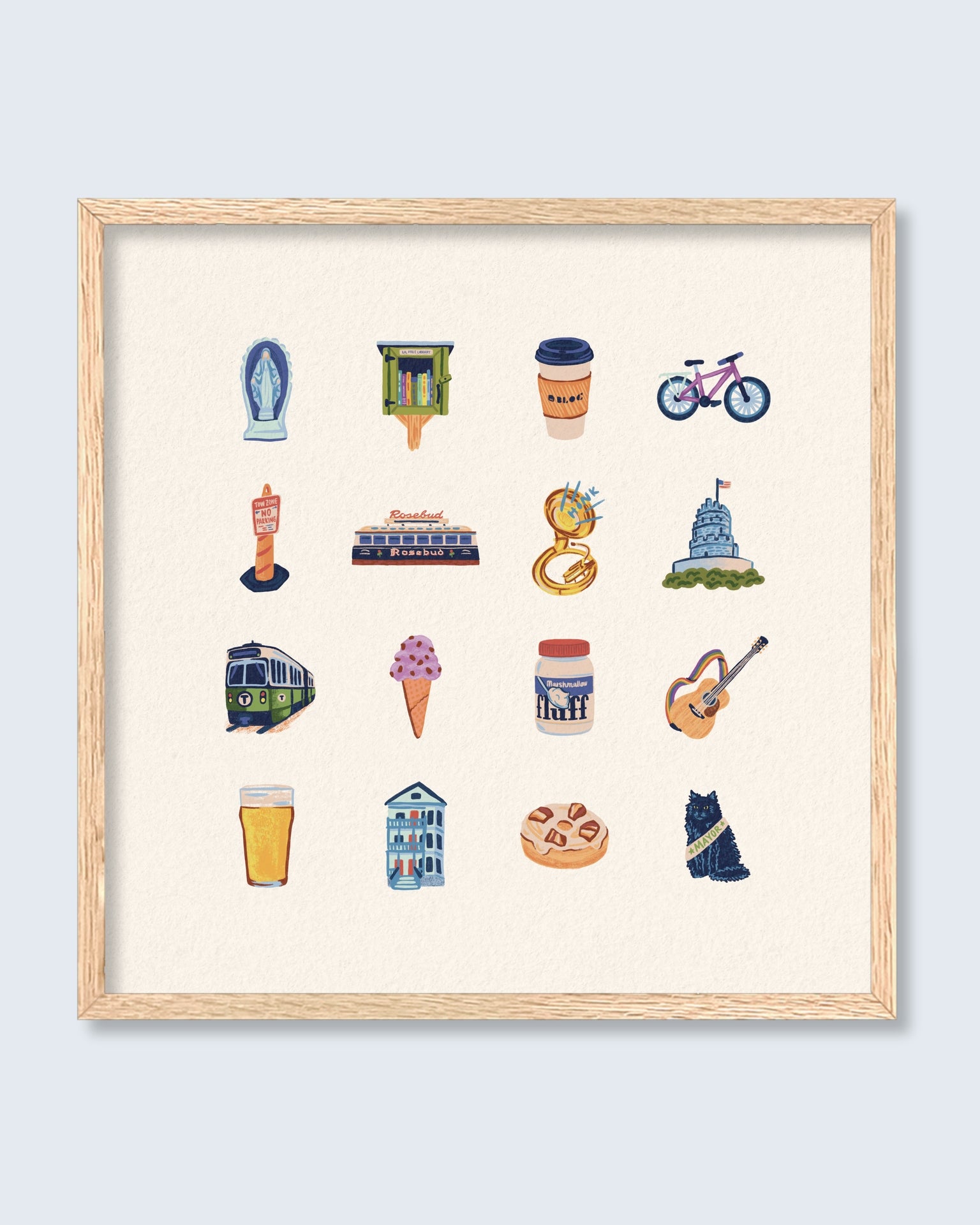 I tried to capture the spirit of my beloved neighborhood of Somerville, MA with hand-illustrated favorites like the Rosebud Diner, Prospect Hill Tower, Little Free Libraries, local coffee, classic triple-decker homes, bike rides through the city, treats from Union Square Donuts, and tributes to my favorite local festivals like Porch Fest, Honk! Fest, and Fluff Fest. Each was thoughtfully drawn to reflect the charm and history that make this city unique. Hang it anywhere you want a reminder of neighborhood pride, creativity, and community joy. This piece is the perfect gift for locals, newcomers, or anyone who has felt at home in Somerville.